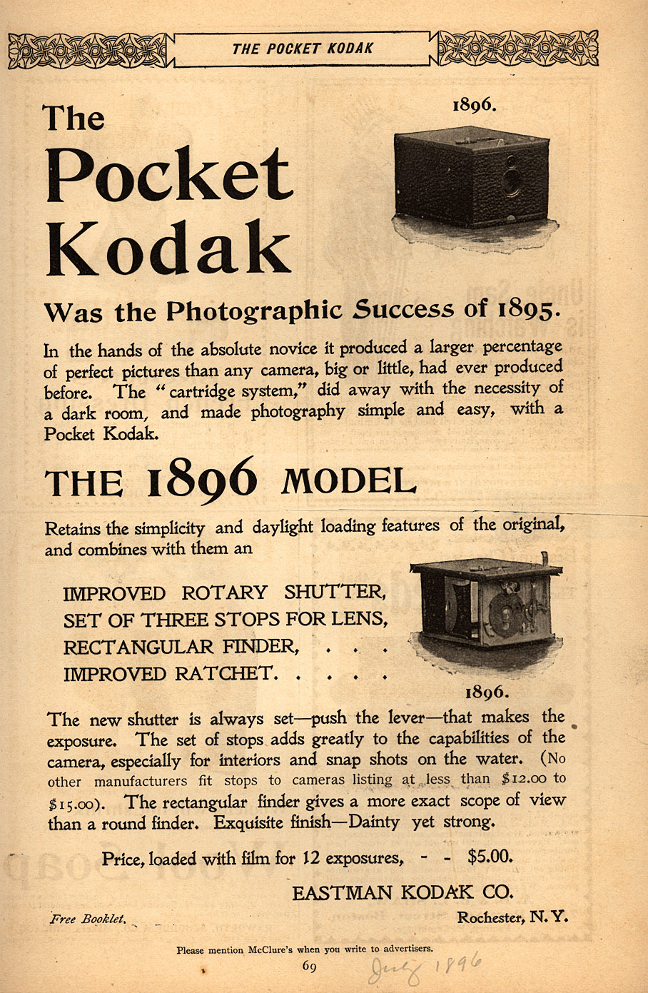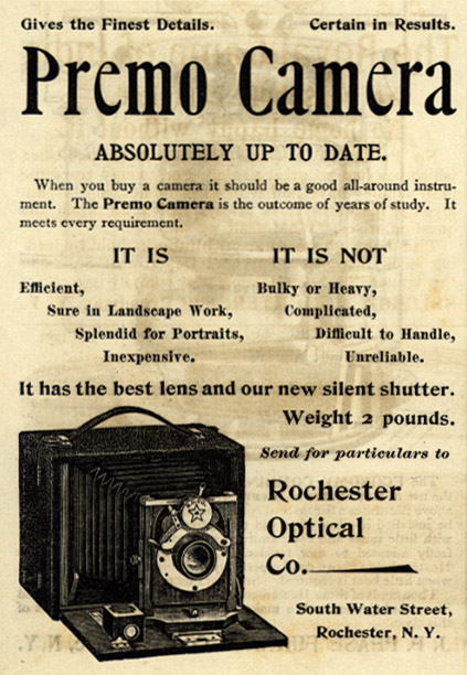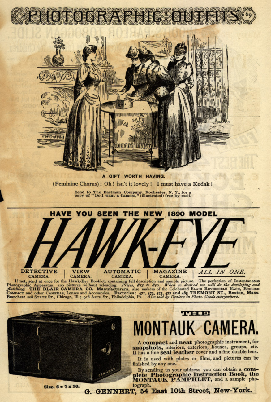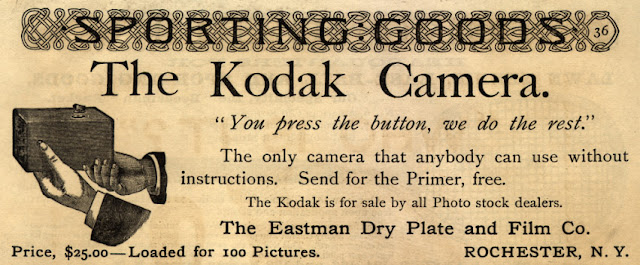 В 1888 году оптическая система была усовершенствована, и на рынок вышла первая камера «Кодак» размером примерно 6 x 3,5 x 4 дюйма и сопровождаемая инструкцией, содержащей всего лишь набор элементарных действий: направить камеру; нажать на кнопку; повернуть ключ; дернуть шнур.